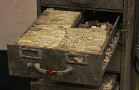 In photo: A file cabinet filled with disintegrating burial records from the Burr Oak Cemetery in Alsip is shown at a Tuesday news conference. The cemetery’s records are in such bad shape that officials are fearful that they will never be able to bring complete closure to the hundreds of confused and angry family members that are looking for answers at the historic suburban Chicago cemetery after four people were accused of digging up graves and reselling plots in a moneymaking scheme. (AP Photo/M. Spencer Green)