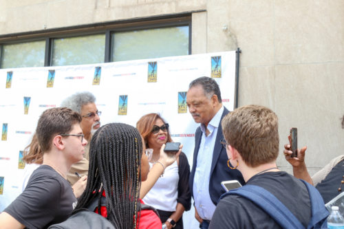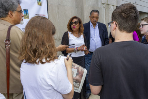 Photo by Dorion Lewis. Students from Columbia College Chicago High School Journalism Program talk to The Rev. Jesse L. Jackson, of Rainbow/PUSH, while Professor Curtis Lawrence and Chicago Defender Vice President stand by.