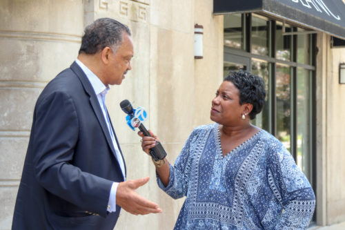 Photo by Dorion Lewis. The Rev. Jesse L. Jackson, of Rainbow/PUSH, speaks to Evelyn Holmes, of ABC7 Chicago.