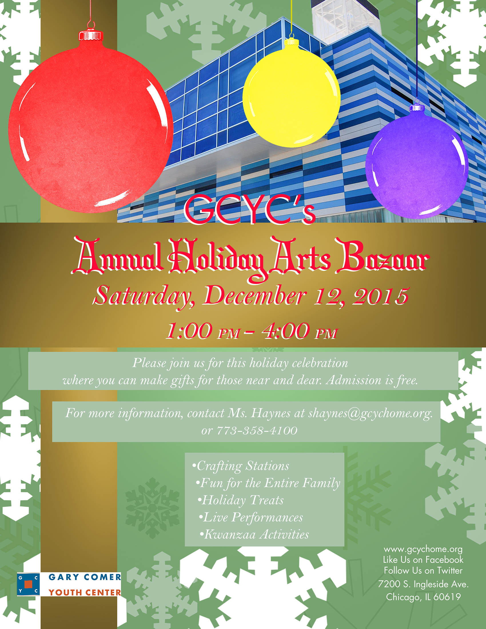The Gary Comer Youth Center will host its annual Holiday Arts Bazaar on Saturday, December 12, 2015 from 1:00-4:00 PM. During this crafting festival community members will be able to create unique gifts for their loved ones, enjoy live performances, and holiday treats.