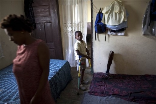 Photo Caption: Sebastian Lamoth, 8, left, looks over at his aunt, Roseleine Royer, at his home in Port-au-Prince, Haiti, Monday Jan. 10, 2011. Lamoth’s leg was amputated due to an injury suffered in the Jan. 12, 2010 earthquake. Almost one year has passed since the magnitude-7.0 quake that killed more than 220,000 people and left millions homeless. (AP Photo/Ramon Espinosa)