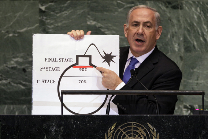 In this Sept. 27, 2012, file photo, Prime Minister Benjamin Netanyahu of Israel shows an illustration as he describes his concerns over Iran’s nuclear ambitions during his address to the 67th session of the United Nations General Assembly at U.N. headquarters. (AP Photo/Richard Drew, File)