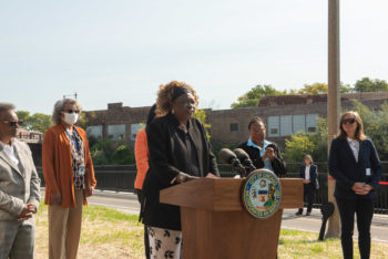 Metropolitan Water Reclamation District of Greater Chicago (MWRD) Vice President Barbara McGowan joined Chicago Mayor Lori Lightfoot, city officials and partners to unveil the new Irving Park Road Bridge and underpass to link a final segment connecting the 312 RiverRun trail along the North Branch of the Chicago River. The 312 RiverRun provides a recreational amenity that connects three parks along the river for nearly two miles from Montrose to Belmont avenues via the Riverview Bridge that was completed in 2019.