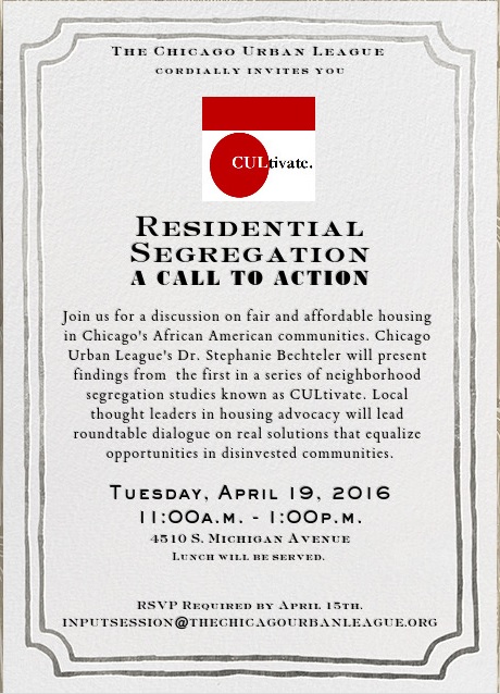 Chicago Urban League’s Dr. Stephanie Bechteler will present findings from the first in a series of neighborhood segregation studies known as CULtivate, Tuesday, April 19th 11am -1pm. See details on the discussion below.