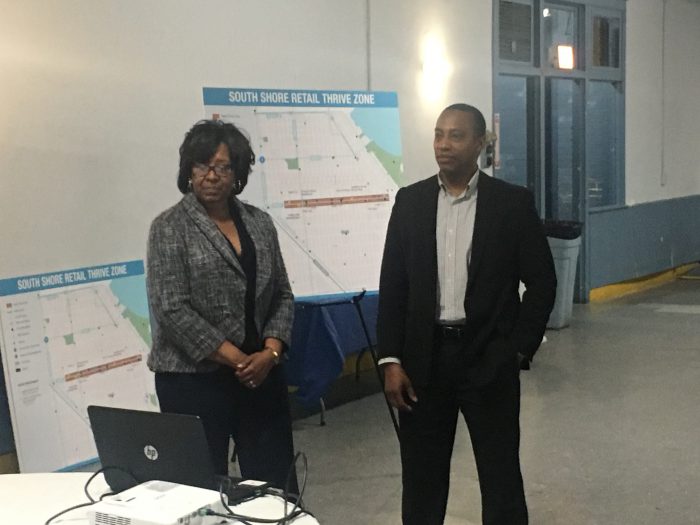The standing-room only meeting held in the basement of the Our Lady of Peace Catholic Church, 7851 S. Jeffery Ave., was hosted by 8th Ward Ald. Michelle Harris and 7th Ward Ald. Greg Mitchell as the two elected officials’ wards are linked by 79th Street. Chatham’s Retail Thrive Zone runs only along 79th St. from Cregier Ave. to slightly beyond Exchange Ave.