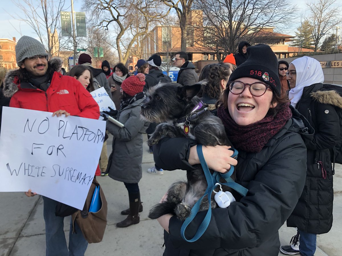 “We’re out here, bright and early, to say white supremacists are not welcomed here,” says Everett Pelzman, one of the organizers of the event and a member of UChicago Socialists. “We’re taking a stand this morning because we know that when Steve Bannon can saunter on to this campus, and into this community unopposed, that normalizes white supremacy.”